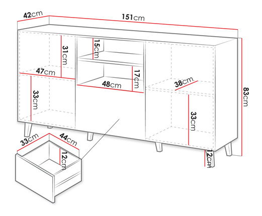 szélesség: 151 cm, magasság: 82 cm mélység : 40 cm