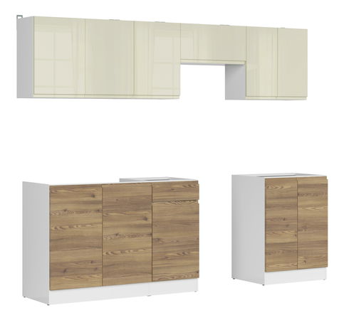 Konyhabútor 240 cm Junona Line (fényes vanília + sibiu arany fenyő + fehér)