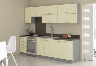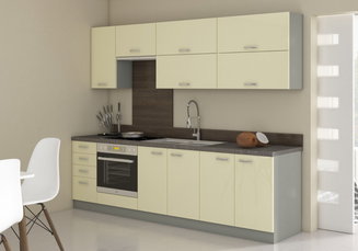 A 180 cm vagy 240-260 cm hosszú egyenes konyhablokkok kisebb helyekre alkalmasak. Az egyszerű és kompakt kialakítás hatékonyan kihasználja a korlátozott helyet. Az összes munkazóna egy síkban történő elhelyezése minimálisra csökkenti az egyes részek közötti mozgás szükségességét, ami hatékonyabbá teszi a munkát. Az egyenes vonal több helyet hagy a konyhában, és így szellős és nyitott teret teremt.