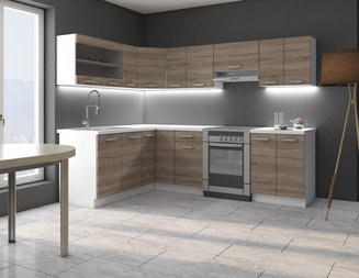 A konyhaszekrények halhatatlan mintája a fa dekor. A tölgy könnyű változatai, például a sonoma tölgy vagy a kézműves tölgy népszerűek, ezt követi a cseresznye vagy az éger. A színváltozatok közül a fehér időtlen árnyalatai, a bézs, a szürke különböző változatai, vagy az elegáns fekete fával kombinálva jöhet szóba. A matt felületek jobban ellenállnak a karcolásoknak és az ujjlenyomatoknak, viszont a fényes előlapok visszaverik a fényt és ragyogóvá teszik a helyiséget.