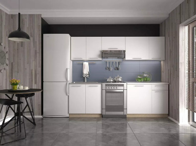 A 180 cm vagy 240-260 cm hosszú egyenes konyhablokkok kisebb helyekre alkalmasak. Az egyszerű és kompakt kialakítás hatékonyan kihasználja a korlátozott helyet. Az összes munkazóna egy síkban történő elhelyezése minimálisra csökkenti az egyes részek közötti mozgás szükségességét, ami hatékonyabbá teszi a munkát. Az egyenes vonal több helyet hagy a konyhában, és így szellős és nyitott teret teremt.