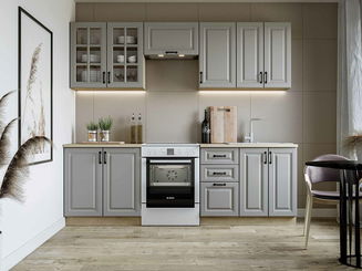 A 180 cm vagy 240-260 cm hosszú egyenes konyhablokkok kisebb helyekre alkalmasak. Az egyszerű és kompakt kialakítás hatékonyan kihasználja a korlátozott helyet. Az összes munkazóna egy síkban történő elhelyezése minimálisra csökkenti az egyes részek közötti mozgás szükségességét, ami hatékonyabbá teszi a munkát. Az egyenes vonal több helyet hagy a konyhában, és így szellős és nyitott teret teremt.