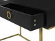 Ez az egyedi bútordarab dekoratív és praktikus kiegészítője lehet nappalijának, hálószobájának vagy előszobájának. A konzolasztal geometrikus formájával és modern stílusával tűnik ki. Az MDF anyag, a matt felület és az arany fém lábak kombinációjának köszönhetően nagyon elegánsnak tűnik. Az asztal két fiókkal is rendelkezik, így fésülködőasztalként vagy stílusos íróasztalként is használható.