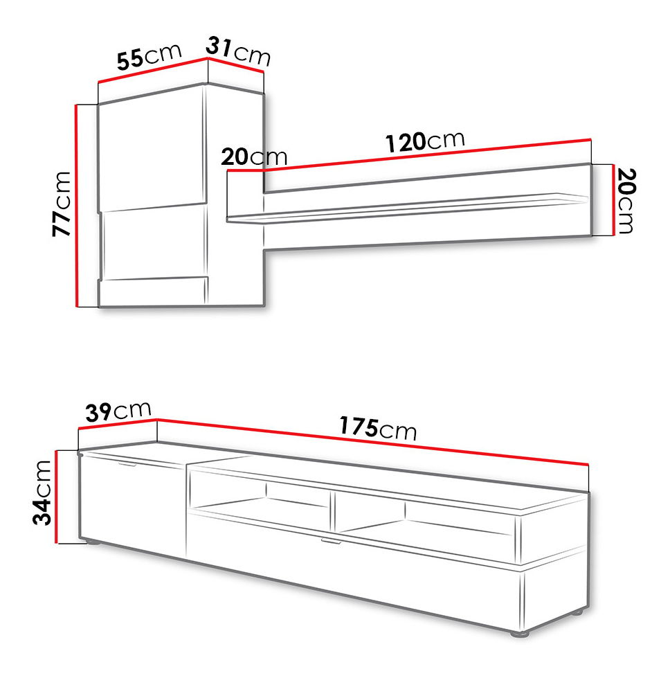 A nappali fal ideális választás azok számára, akik kényelmet és stílust keresnek. A modern belső terek kivételes berendezést igényelnek, mint például a James nappali fal. A bútorok egyszerűségét és eleganciáját friss színek hangsúlyozzák – a fehér és a fa mintázatát utánzó színek kombinációja egyedülálló hatást kelt. Az elemek méretei: TV-szekrény: szélesség: 175 cm, magasság: 34 cm, mélység: 39 cm, Vitrina: szélesség: 55 cm, magasság: 77 cm, mélység: 31 cm, Polica: szélesség: 120 cm, magasság: 20 cm, mélység: 20 cm Anyag: 16 mm vastag laminált lemez, műanyag lábak és fogantyúk, „PUSH TO OPEN” nyitórendszer, LED-es világítás opcionális kiegészítőként felár ellenében Garancia: 24 hónap