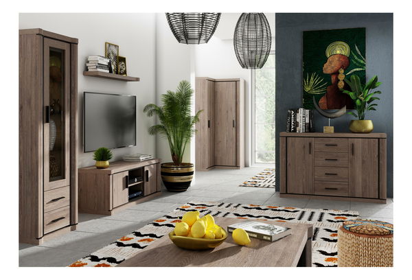 A szarvasgombás tölgyfa dekorációjú Douglas nappali meleg hangulatot és időtlen eleganciát visz otthonába. A Douglas 01 komód négy tágas fiókkal és két polcos szekrényel rendelkezik, amelyek ideálisak ruhák vagy dokumentumok tárolására. A Douglas 12 TV-állvány három polccal és két szekrényével rengeteg helyet biztosít multimédiás eszközeinek. A Douglas 16 üveges, három polcos vitrin elegáns dekorációs elemeket kínál, míg a két fiók további tárolóhelyet biztosít. A Douglas 10 polc ideális könyvek vagy apró dekorációk számára, a Douglas 15 dohányzóasztal pedig kiegészíti a szoba összképét. A Douglas 21 sarokgardrób hatékonyan használja ki a helyet és bőséges tárolóhelyet biztosít. Ezzel a szettel harmonikus és funkcionális belső teret kapsz, amely természetes megjelenésével és praktikumával fog lenyűgözni.
