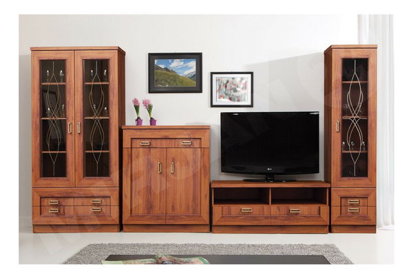 LTD (16 mm), lap 32 mm-ig; védő PVC él (2 mm); díszlécek az ajtón: MDF; fogantyúk: fém; lábak nélkül; fióksínek; polcok: DTD tábla; dekoratív díszek ragasztva a vitrinre.