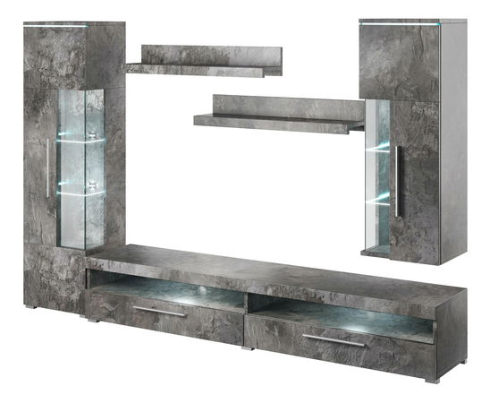 MutasdEzt a stílusos nappali falat úgy tervezték, hogy funkcionális tárolóhelyet kínáljon a modern belső térben. Magas és alacsony esztétikus edzett üveges vitrinből, TV szekrényből és két akasztós polcból áll, melyek praktikus és esztétikus térrendezést tesznek lehetővé. Mind a karosszéria, mind az elülső rész laminált lapból készült, ezüstszínű műanyag fogantyúkkal és szürke lábakkal kiegészítve. A golyóscsapágyas fiókok gondoskodnak a zökkenőmentes működésről. A világítás felár ellenében történő bővítése vonzó megjelenést kölcsönöz a vitrineknek.