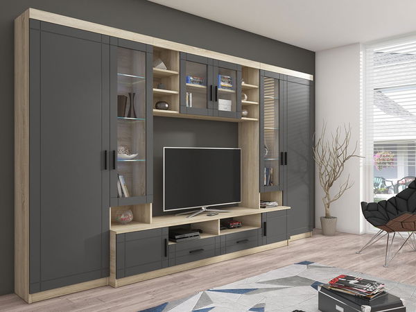 A Merasoja lakófal funkcionalitásával és érdekes megjelenésével vonz. A tágas polcrendszernek köszönhetően nem csak az edényeket vagy a használt terítőket tárolhatja könnyedén. A bútorok sarkában sok praktikus rekeszt is talál a dolgok tárolására. A bútorok üvegszekrényekkel és nyitott polcokkal rendelkeznek, ahol elhelyezheti dekorációit. A nappali falának modern kialakítása szemet gyönyörködtető, a divatos színek pedig a népszerű skandináv bútorokat idézik. Kiváló minőségű laminált lapból készült, és sokáig bírja.