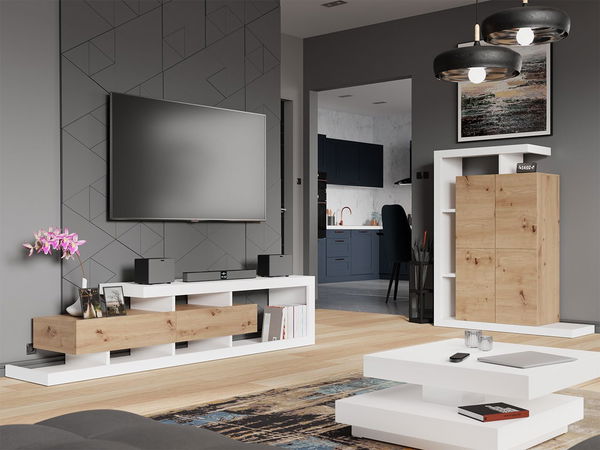 dizájner polcokkal felszerelt komód és TV-szekrény