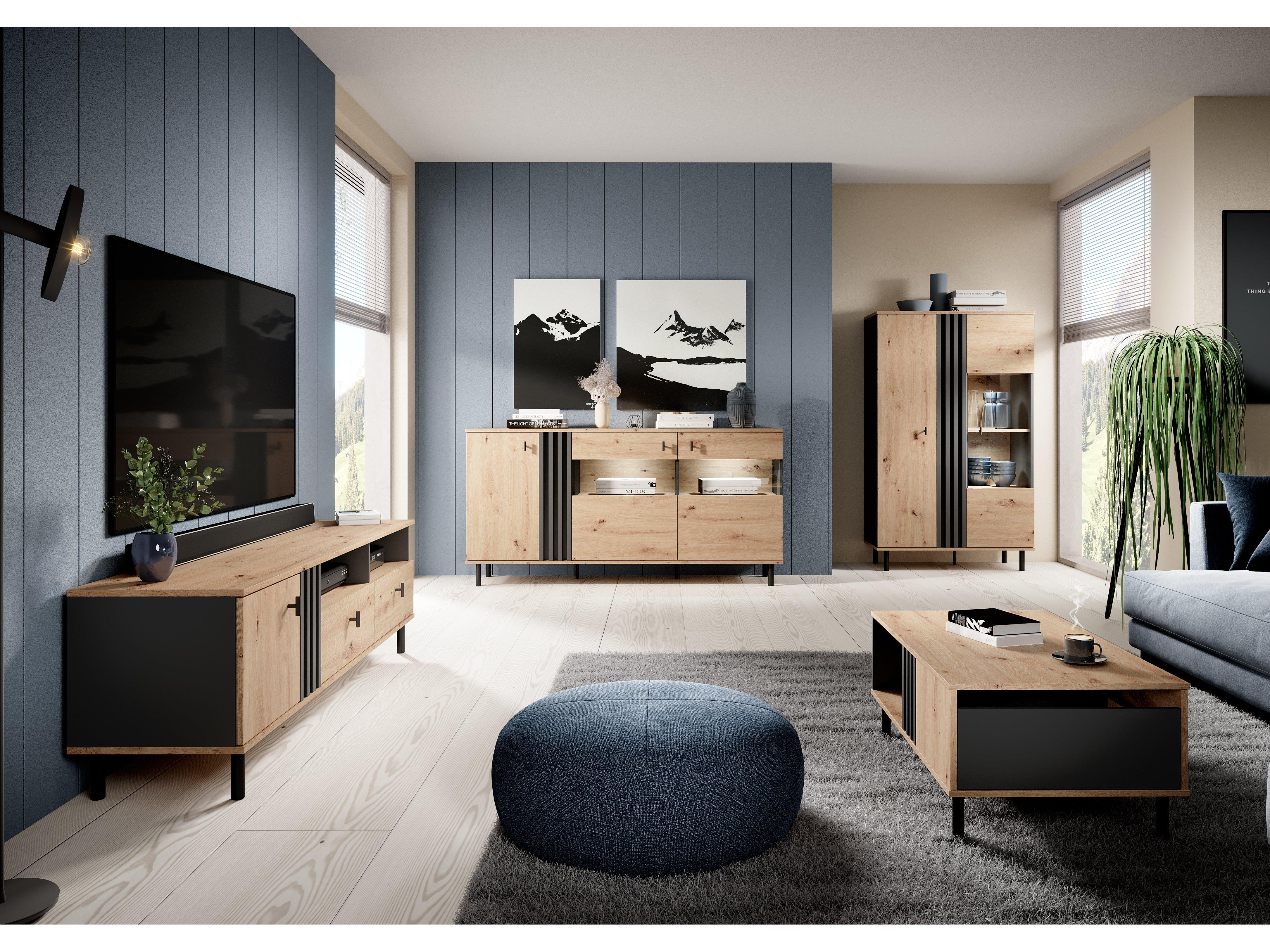 A természetes, artisan tölgy és a fekete antracit kombinációja tökéletes egyensúlyt teremt az otthonos melegség és a modern elegancia között a Madeira 1 nappaliban. Az üvegajtós vitrinek könnyedséget visznek a térbe, miközben helyet biztosítanak a dekorációk kihelyezésére, míg a TV-állvány és a dohányzóasztal funkcionális és dizájnnal összhangban lévő alapot alkot a nappalinak. A robusztus kialakítás és a jellegzetes faerezet kiemeli az időtlen megjelenést, amely karakteres belső terekbe illik. A Madeira 1 ideális azok számára, akik stílusosan, természetesen és ugyanakkor praktikusan szeretnének élni.