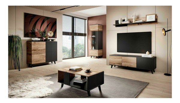 A Ranae 1 nappali, Wotan tölgy és fekete kombinációjában, modern és egyszerre hangulatos megjelenésű. A KM2 szekrény és a W1 vitrin praktikus tárolóhelyet, valamint dekorációs helyet biztosít. Az RTV1 TV-állvány funkcionalitást biztosít tévézés közben, a P1 polc pedig harmonikusan kiegészíti az összképet. A természetes fa és a fekete részletek kontrasztjának köszönhetően a szett stílusos és modern enteriőrbe illik.