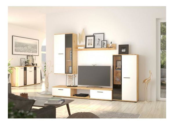 A fehér és a artisan tölgy kombinációja a Saul 1 nappaliban egyszerre légies, hangulatos és modern – ideális kombináció egy olyan belső térbe, amelynek célja a kikapcsolódás és a reprezentáció kellemes helyszíne. A nappali falán elfér egy tévé, dekorációk és tárolási megoldások, amelyek segítenek rendben tartani a dolgokat anélkül, hogy zsúfoltnak tűnnének. Egy letisztult vonalvezetésű, kontrasztos színű fiókos szekrény funkcionálisan és vizuálisan is kiegészíti az egészet, harmonikus benyomást keltve. A Saul 1 egy praktikus megoldás időtlen dizájnnal, amely élvezetesebbé teszi a mindennapokat a lakótérben.