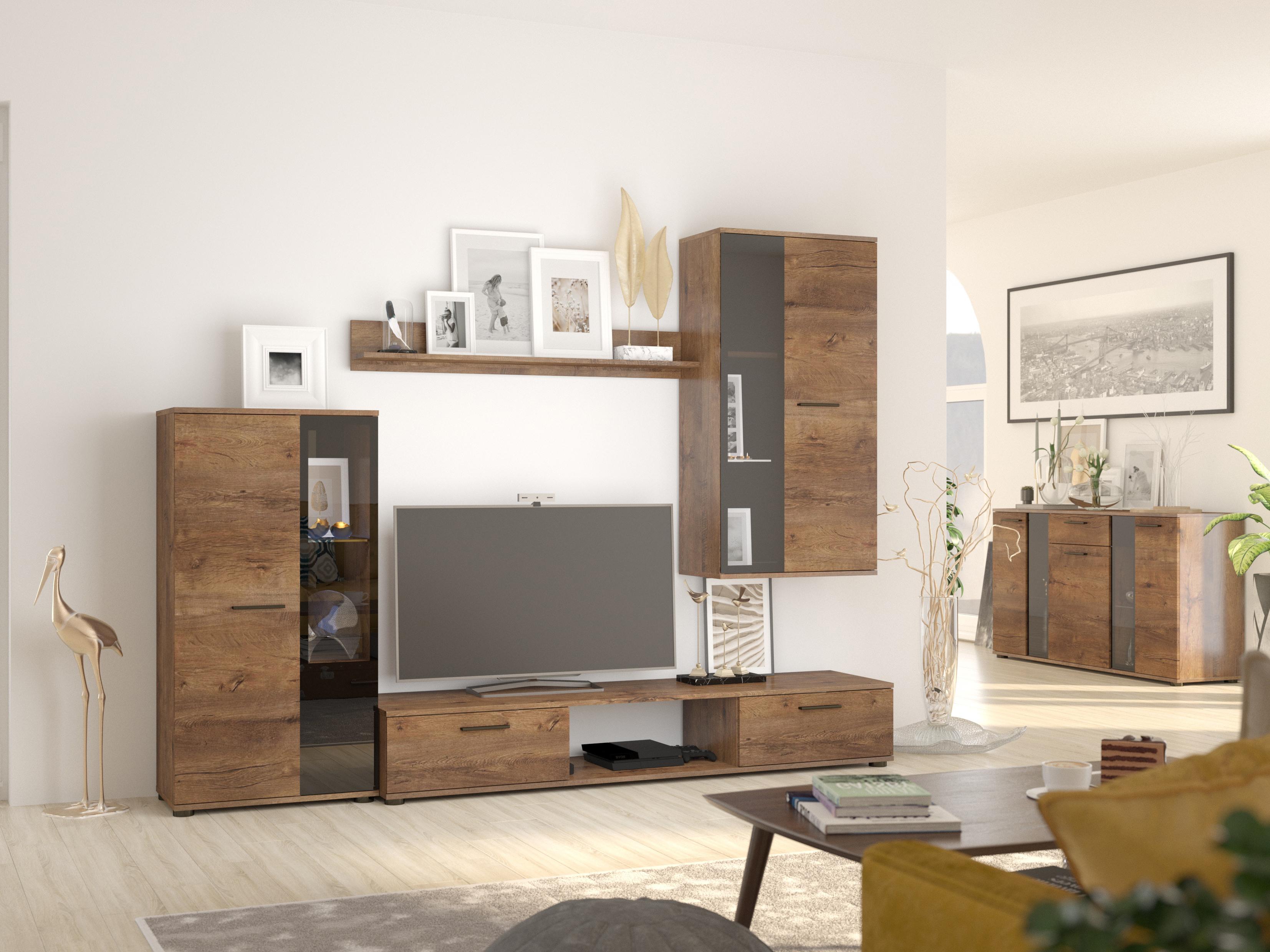 A Saul 1 nappali sötét Lefkas tölgyfa mélységet, karaktert és természetes eleganciát kölcsönöz a térnek, egyszerre időtlen és otthonos érzetet keltve. A nappali fala átgondolt tárolási megoldásokat kínál a tévének, elektronikai eszközöknek és apróságoknak, amelyeket mindig kéznél szeretne tartani. Egy üvegrészes vitrinek segítségével ízlésesen bemutathatod kedvenc dekorációidat vagy ételeidet, és praktikus értékkel bíró látványossággal a tér központi elemévé válhat. A Saul 1 ebben a dekorban ideális választás azok számára, akik természetes megjelenésű, funkcionális és finoman rusztikus belső térre vágynak.