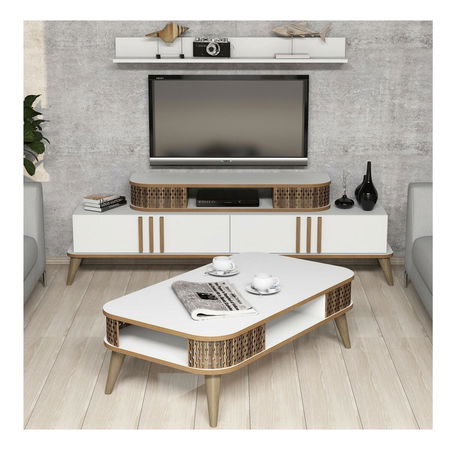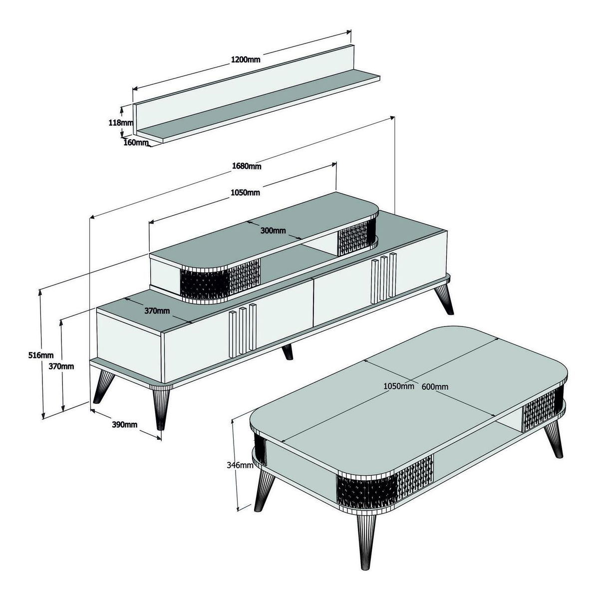 Vastagság: 18 mm. TV egység méretei: Szélesség: 168 cm. Magasság: 51,6 cm. Mélység: 39 cm. TV polc méretei: Szélesség: 105 cm. Magasság: 14,6 cm. Mélység: 30 cm. Fali polc méretei: Szélesség: 120 cm. Magasság: 11,8 cm. Mélység: 16 cm. Dohányzóasztal méretei: Szélesség: 105 cm. Magasság: 34,6 cm. Mélység: 60 cm