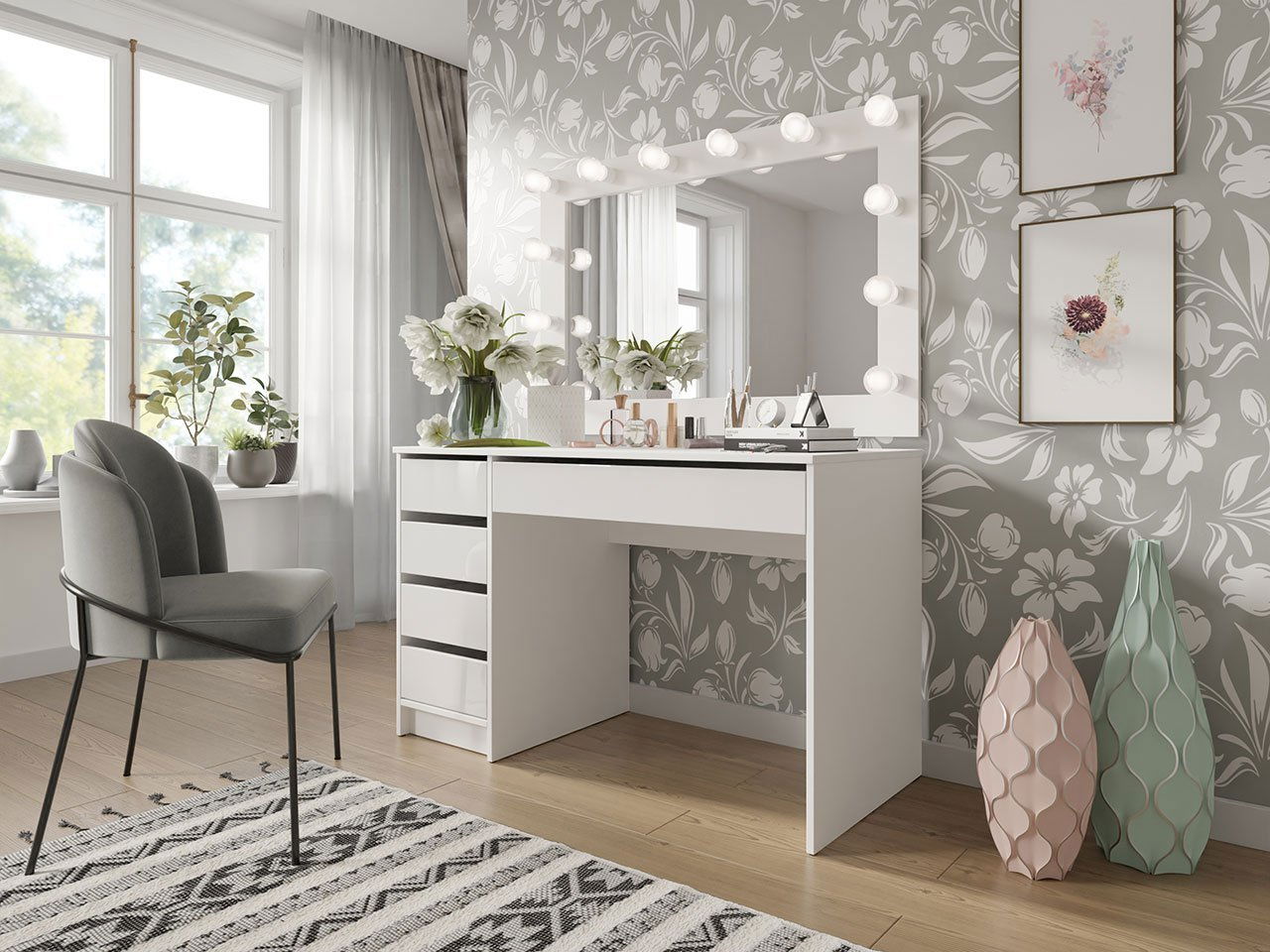 MutasdEz a fésülködőasztal görgős fiókrendszereken elhelyezett fogantyú nélküli fiókokkal van felszerelve, amelyek megkönnyítik a nyitást és a zárást. Ez a modell rendkívül sokoldalú. Ez azért van így, mert az aljzatokat balra vagy jobbra rögzítheti – Ön dönti el, hol legyenek!