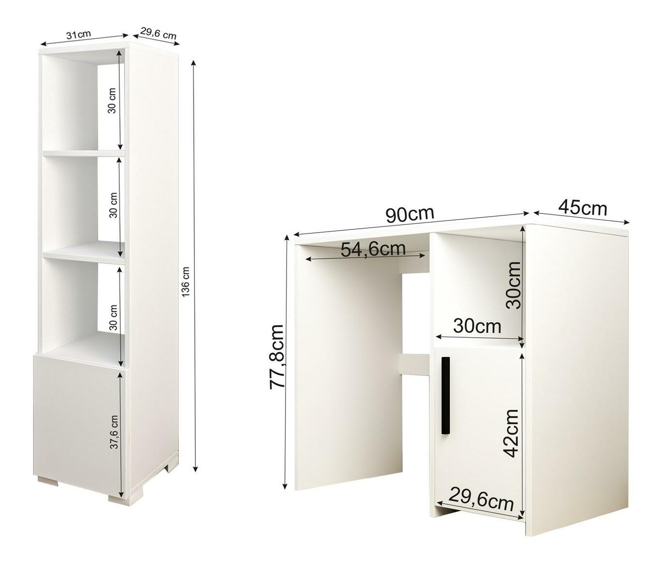Vastagság: 18 mm. Íróasztal méretei: Szélesség: 90 cm. Magasság: 45 cm. Mélység: 77,8 cm. Polc méretei: Szélesség: 31 cm. Magasság: 136 cm. Mélység: 29,6 cm