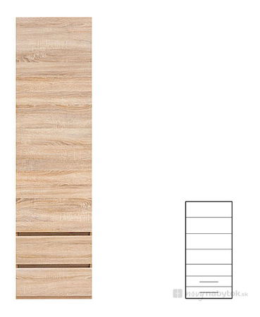 Keskeny Academica polcos szekrény Sonoma tölgy színben. 4 polcot és két fiókot találunk rajta. Bal és jobb kialakításban is összeszerelhető.
