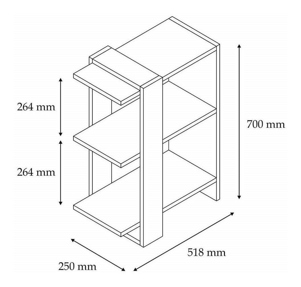 vastagság: 18 mm, szélesség: 51,8 cm, magasság: 70 cm, mélység: 25 cm, polc magassága: 26,4 cm