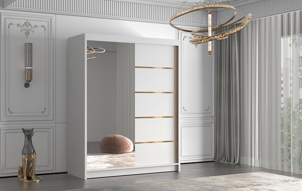 MutasdA gardrób ideális választás azok számára, akik a praktikusságot részesítik előnyben a dizájn helyett. A gardrób tolóajtós, és rengeteg tárolóhelyet kínál a ruhaneműk, ruhák és kiegészítők számára. A gardrób bal oldali részében akasztórúd, a jobb oldalon polcok találhatók. A felső részben van még egy tárolóhely. A szekrény 16 mm vastag laminált lapból készült, sima fehér felülettel. A tolóajtó rendszer biztosítja a kényelmet és a kényelmes mindennapi használatot. A fogantyúk téglalap alakúak és ezüst színűek. A szekrény egy hosszában elhelyezett akasztórudat és összesen 5 polcot tartalmaz.