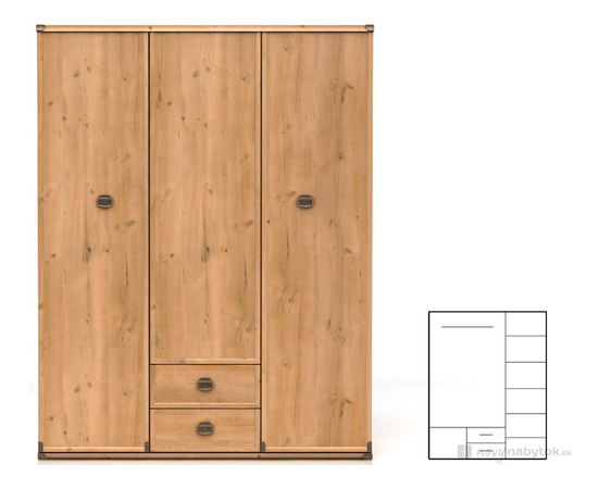 Vadnyugati stílusú ruhásszekrény nagy tárhellyel. Főleg a fiatalokat szólít meg ez a stílus pont ezért lesz tökéletes az ő szobájukba, de tökéletesen illik a hálószobába is. 3 ajtója van és az ajtók alatt két kisebb fiókot találunk. A fogantyúi dekoratívan vannak kovácsolva.