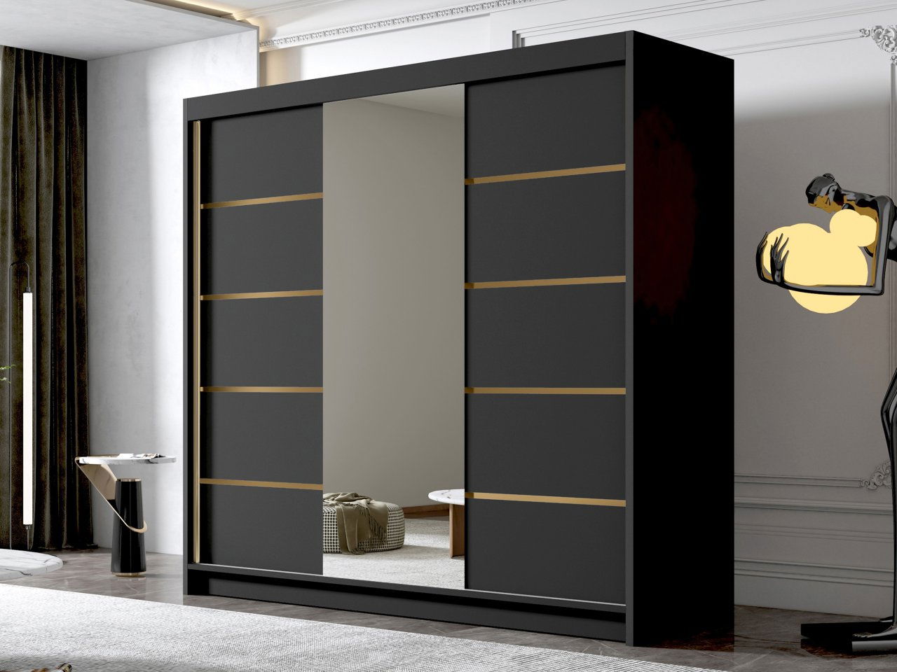 Ruhásszekrény tolóajtókkal Fozzurt VI 200 (fekete + arany) (tükörrel)