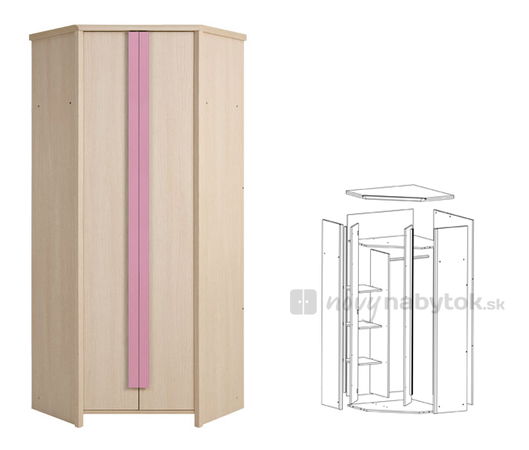 Sarokszekrény tölgyfa világos belluno színben és választható színű szalag kilincs: rózsaszín, kék.