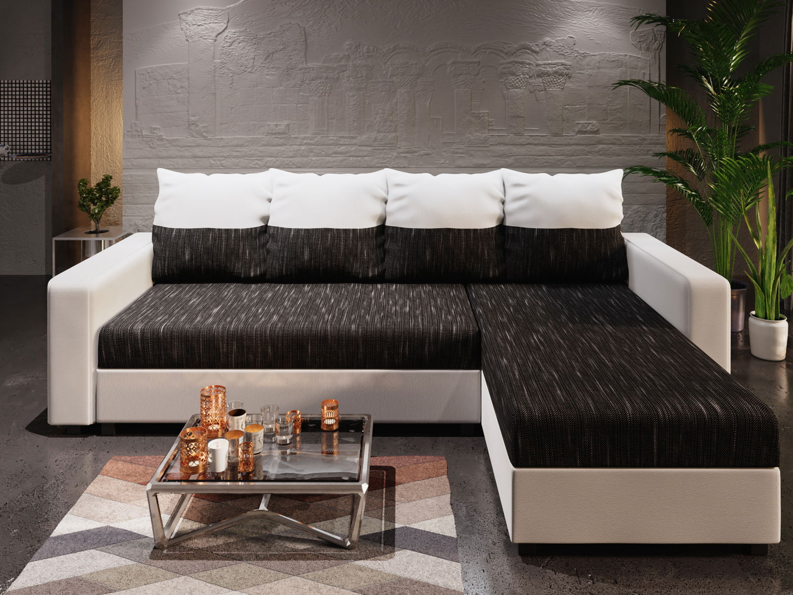 MutasdA modern Adrait sarokkanapé kényelmet nyújt a nappaliban. Stílusos és modern, egyedi dizájnelemekkel rendelkezik. Négy kétoldalas párna van hozzá, mindkét oldalon más-más motívummal. Ennek az elemnek köszönhetően könnyedén megváltoztathatja a nappali megjelenését. A kanapé szétnyitható.