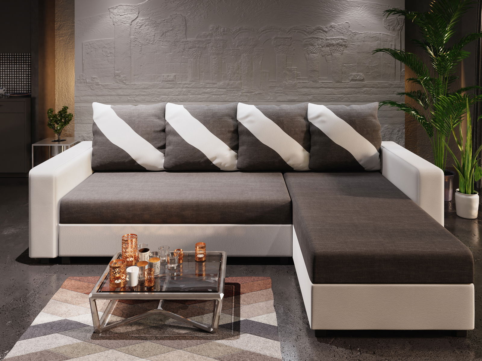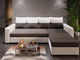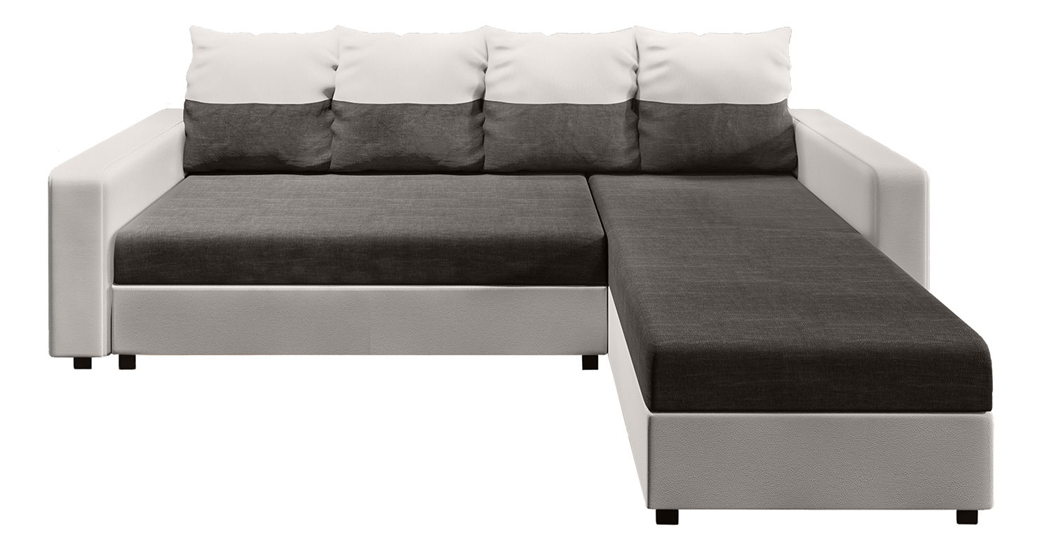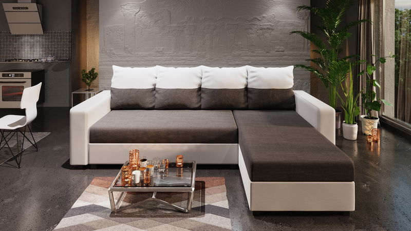 MutasdA modern Adrait sarokkanapé kényelmet nyújt a nappaliban. Stílusos és modern, egyedi dizájnelemekkel rendelkezik. Négy kétoldalas párna van hozzá, mindkét oldalon más-más motívummal. Ennek az elemnek köszönhetően könnyedén megváltoztathatja a nappali megjelenését. A kanapé szétnyitható.