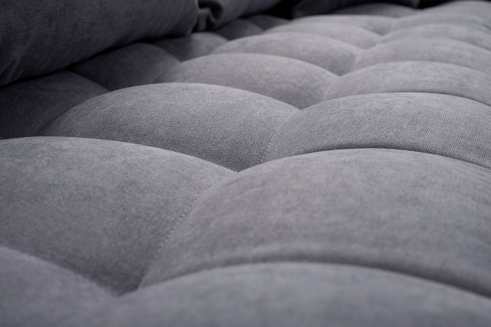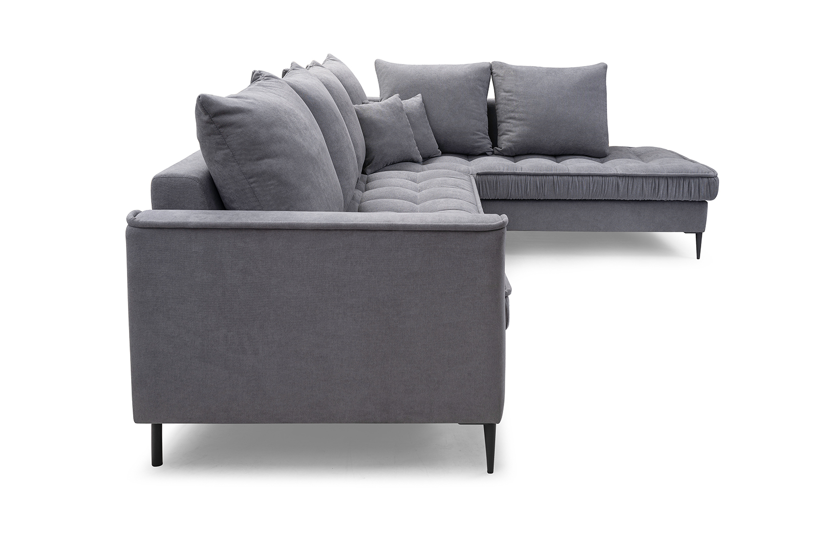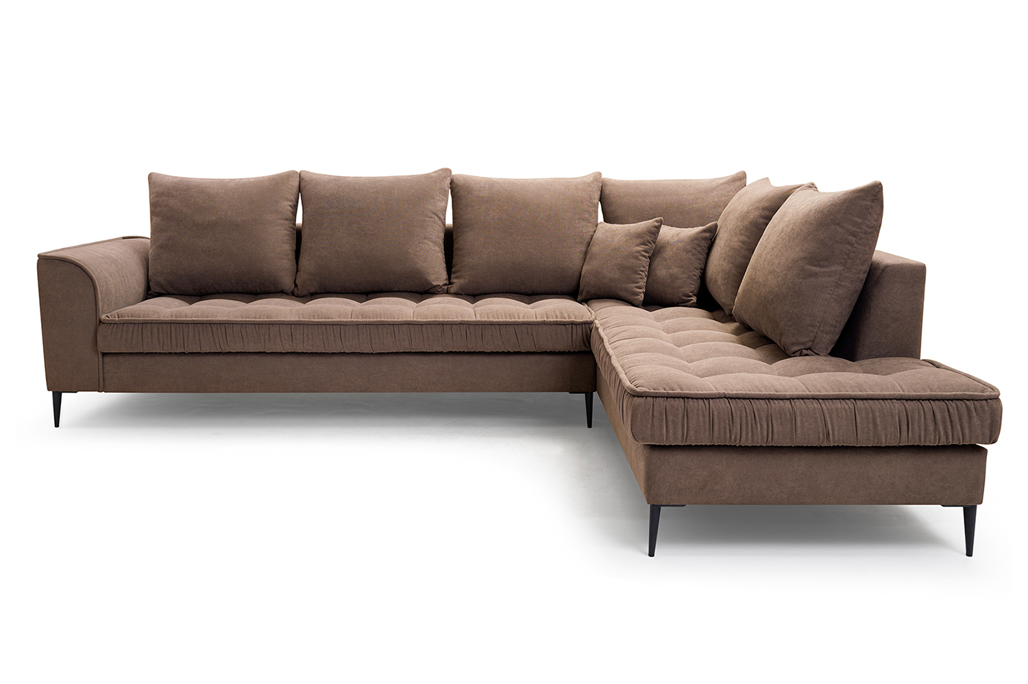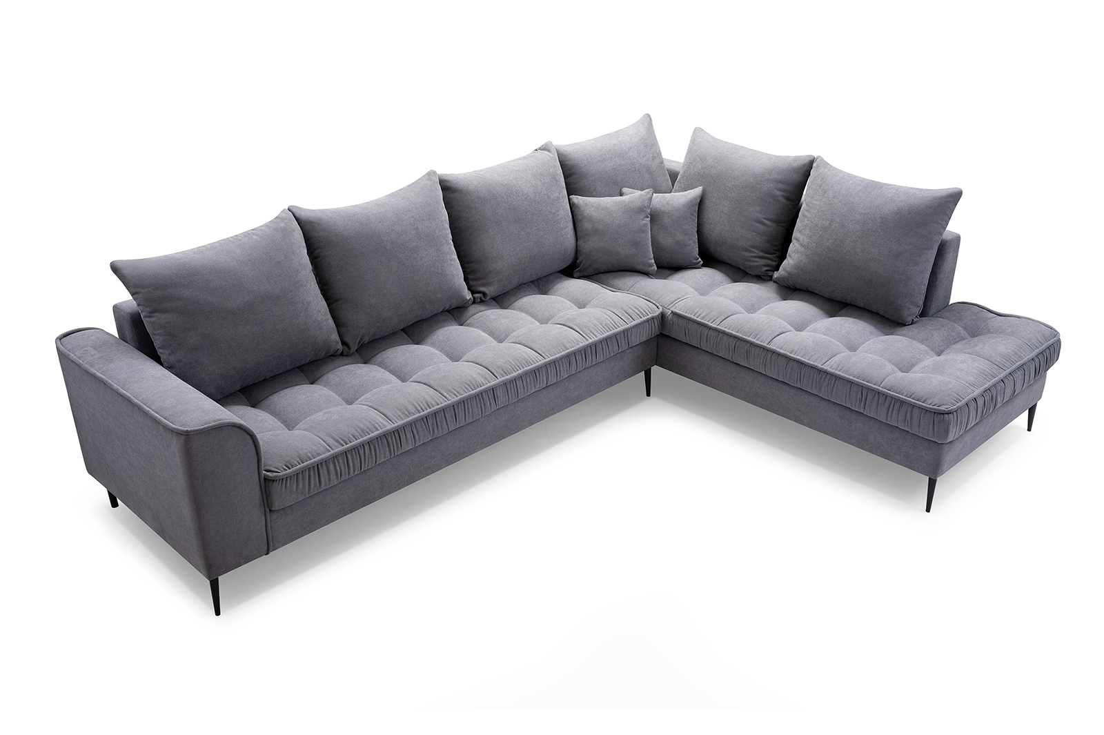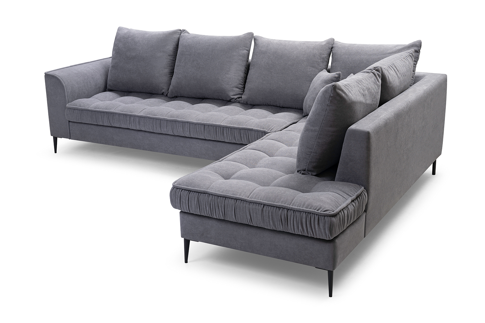Vigyen frissességet és eleganciát nappalijába ennek a modern sarokkanapénak köszönhetően. Az ülés háttámlája is kárpitozott, így a térben is elhelyezhető. A kanapé fém lábakon áll.