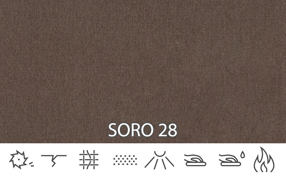 A Soro szövet 100% poliészterből készült velúr fedőszövet, kötőszerkezettel. Puha és puha tapintású, kellemes fedőanyag, amely nem nyúlik. Magas eredményt ért el a Martindale tesztben, akár 100 000 ciklusban. Ez azt jelenti, hogy kopásálló, és több éves használat után sem hagy lyukakat. Az ilyen eredménnyel rendelkező anyagokat közterületi használatra alkalmas anyagok tartalmazzák – például buszokban. Ellenáll a gyakori használatnak. A Soro szövet megfelelt a REACH irányelvnek, ami azt jelenti, hogy nem tartalmaz káros vegyszereket.