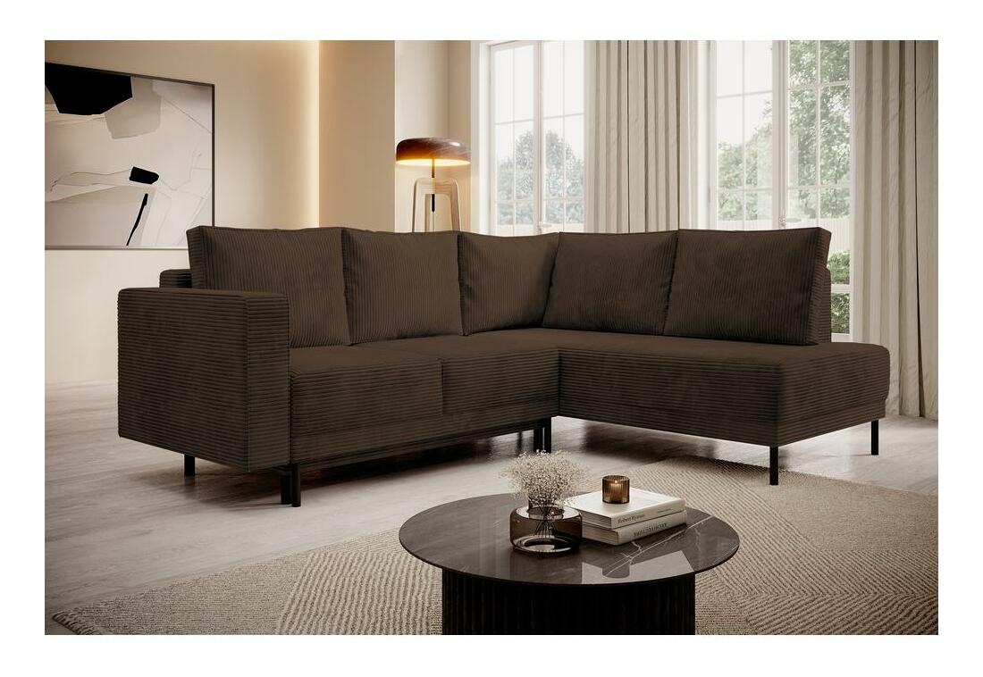 MutasdEgy stílusos nappaliról álmodozik, ahol kényelmesen pihenhet? A sarokkanapé sláger lesz A sarokkanapé egy modern formatervezésű forma, amely tökéletesen illeszkedik minden divatos enteriőrbe. Egyszerű, minimalista forma, vékony fekete lábak és puha párnák a háton – mindez rendkívül bájossá teszi, és ideális hely lesz a kikapcsolódásra egy fárasztó nap után. A sarokkanapé alvó funkcióval és könnyen kezelhető DL mechanikával van felszerelve, melynek köszönhetően a bútort gyorsan kényelmes ággyá varázsolhatja vendégei számára. tágas tárolórésszel is rendelkezik, amelyben egy tartalék ágyneműt és egyéb textíliákat tárolhat Termék részletei: a bútor L-alakú, a sarokülés a jobb oldalon található, a dekoratív szegély eleganciát ad az egésznek, a praktikus karfák lehetővé teszik. a kényelmes kartámaszhoz, kartámasz magassága: 68 cm, karfa szélessége: 16 cm, bútorok sötétbarna Poso 06 szövettel kárpitozva, a Poso kordbársony stílusú szövet. A vastag csíkokkal borított felület kellemes tapintású. Nagy kopásállóság, súrlódás és fényállóság jellemzi.