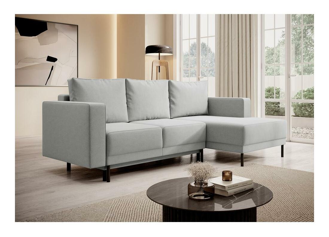 MutasdEgy stílusos nappaliról álmodozik, ahol kényelmesen pihenhet? A sarokkanapé sláger lesz A sarokkanapé egy modern formatervezésű forma, amely tökéletesen illeszkedik minden divatos enteriőrbe. Egyszerű, minimalista forma, vékony fekete lábak és puha párnák a háton – mindez rendkívül bájossá teszi, és ideális hely lesz a kikapcsolódásra egy fárasztó nap után. A sarokkanapé alvó funkcióval és könnyen kezelhető DL mechanikával van felszerelve, melynek köszönhetően a bútort gyorsan kényelmes ággyá varázsolhatja vendégei számára. tágas tárolóval is rendelkezik, amelyben egy tartalék ágyneműt és egyéb textíliákat tárolhat. szürke Castel 80 szövettel van kárpitozva A Castel puha, sima szövet, amelyet nagy súrlódás-, kopás- és foltosodási ellenállás jellemez, így ideális mindennapi bútorokhoz. További előnye az Easy Clean technológia - az anyag könnyen tisztítható, amely lehetővé teszi a szennyeződések könnyű eltávolítását kevés vízzel és puha törlőkendővel.