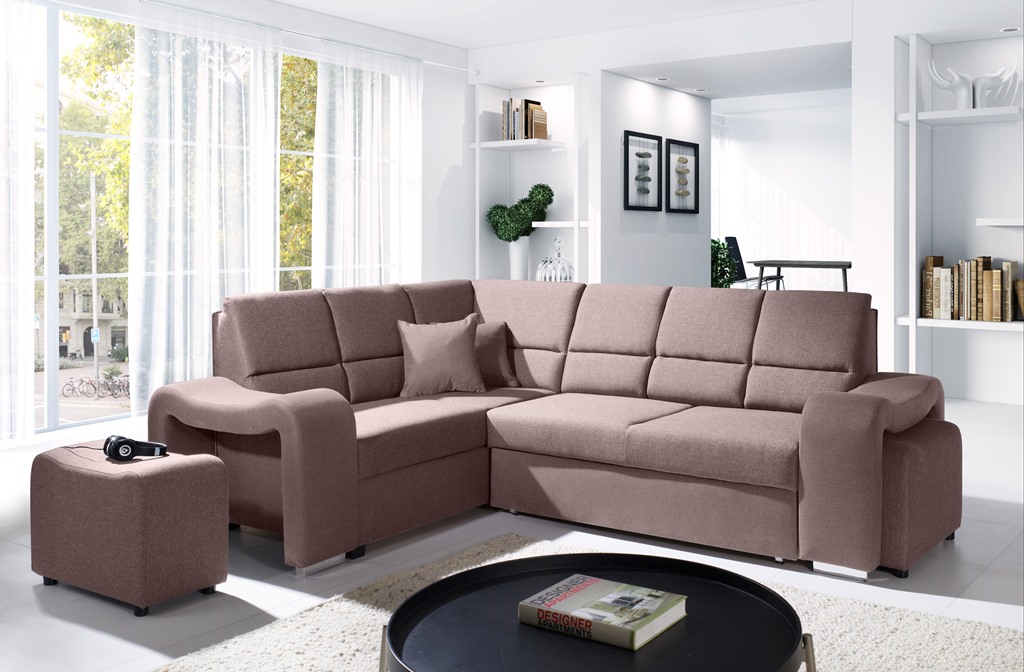Kényelmes, nagy és tágas Wan kanapé két zsámollyal. Több színváltozatban kínáljuk. A kanapénban sok tárolóhely található,és kialakítása helyet kínál az alkalmi alváshoz. Balos és jobbos változatban kapható.