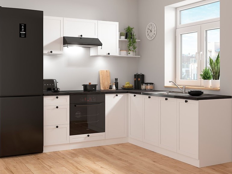 A Junona Line sarokkonyha tökéletes megoldás azoknak, akik értékelik a térszervezés rugalmasságát. Sokoldalúságának köszönhetően könnyedén adaptálhatja a kialakítást balra vagy jobbra, az egyéni igényektől és a szoba elrendezésétől függően. Egy ilyen konyha nemcsak optimalizálja a rendelkezésre álló tér kihasználását, hanem hangulatos és funkcionális helyet is teremt a főzéshez és a szeretteivel való időtöltéshez. A Junona Line konyhabútor tökéletesen szervezett tér. Az alsó rész mindent tartalmaz, amire szüksége van: praktikus ajtós szekrények, tágas szekrény a mosogató alatt, hely a sütőnek és egy funkcionális, három fiókból álló készlet a konyhai kiegészítők számára. A felső függesztett szekrények további helyet biztosítanak az edények és ételek tárolására. Az elegáns, egyszerű fogantyúk hangsúlyozzák a bútorok minimalista jellegét. A Junona sorozattal olyan konyhát hozhat létre, amely nemcsak szép, de mindenekelőtt praktikus a mindennapi használatban.
