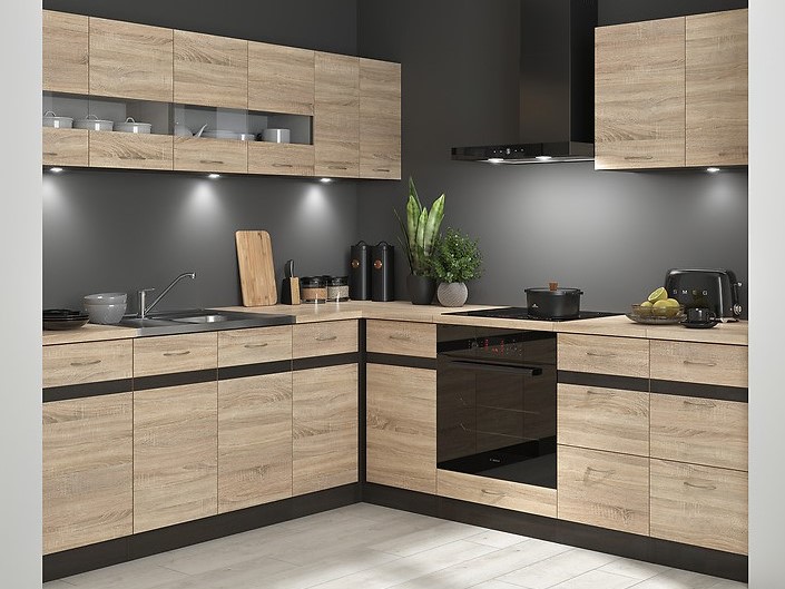 A bemutatott szettben található szekrények tetszés szerint elrendezhetők, így egyéni igényekre szabott konyhaelrendezés hozható létre. Az univerzális frontok balra vagy jobbra is nyithatók. A háztartási gépek nem részei a szettnek.