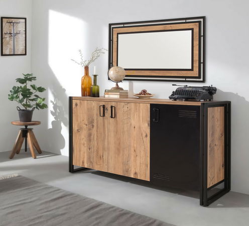 Vastagság: 18 mm. Fém keret (Vastagság: 2 cm,) Fém ajtók. Fém fogantyúk. Méretei: Szélesség: 140 cm. Magasság: 80 cm. Mélység: 45 cm. Oldalsó polc magassága: 20 cm. Szekrény polc magassága: 31 cm