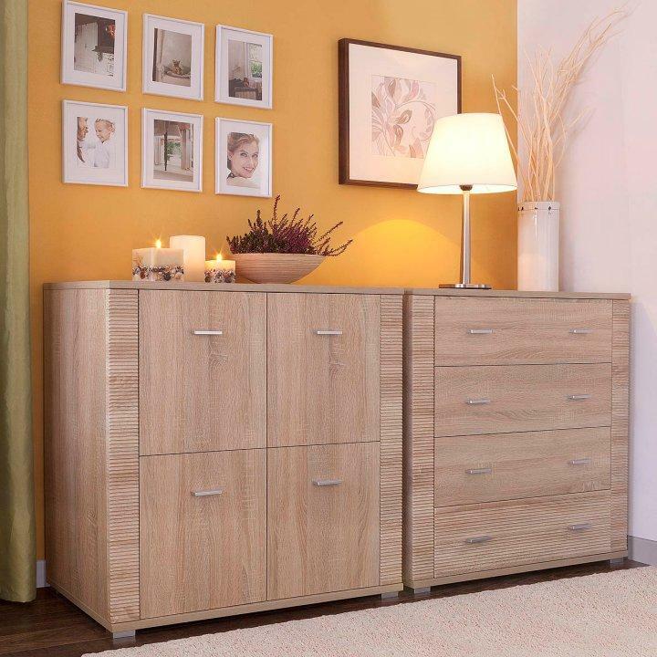 Széles kétrészes komód, 4 egyforma nagy fiókot tartalmaz.