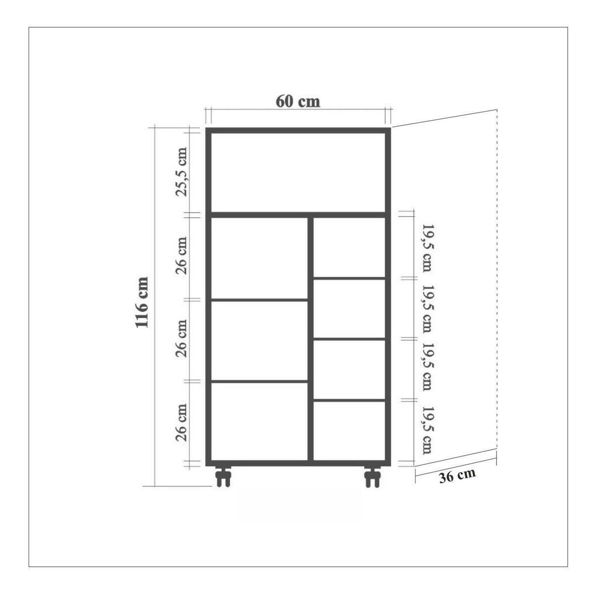 vastagság: 18 mm, rolovacie lábak, uv bevonat szélesség: 60 cm, magasság: 116 cm, mélység: 36 cm, polc magassága: 26 cm