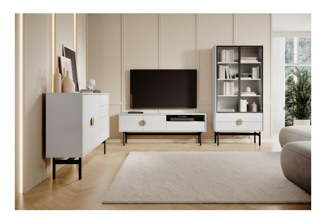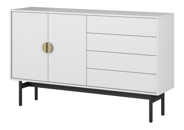 MutasdSzeretné átalakítani otthonát? Kedveli az eredeti megoldásokat és az egyszerű bútorformákat? Kollekciónkkal harmóniát és eleganciát vihet a belső térbe. A fehér színű, egyedi tervezésű komód tökéletesen illik a modern otthonokba. Minőségi laminált forgácslapból készült, mely hosszú távú használatot biztosít. A tartós acélkeret ipari bájt kölcsönöz a bútornak. Az arany fogantyúk nemcsak praktikusak, de elegáns megjelenést is adnak a szekrénynek. A komód négy fiókkal rendelkezik, így ideális tárolási megoldás. Termék részletei: Korpusz és előlapok laminált lapból, fehér 0110 SM korpusz, amely ellenáll a nedvességnek, magas hőmérsékletnek és karcolásoknak. A keret fekete porszórt acélból készült, megkönnyítve a bútor alatti rend fenntartását. Fiókok „push to open” mechanizmussal nyithatók, a fogantyúk aranyszínű, csiszolt acélból készültek.