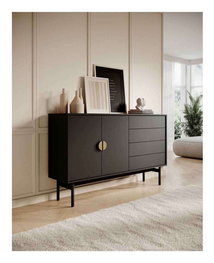 MutasdVáltozást szeretne végrehajtani a belső térben? Szereti az eredeti megoldásokat és az egyszerű bútorformákat? Kollekciónkat választva harmóniát és eleganciát visz a belső térbe, és megörvendezteti vendégeit Az egyedi kialakítású, elegáns bézs-szürke színű komód tökéletesen illeszkedik a modern enteriőrbe. Kiváló minőségű laminált forgácslapból készült, amely biztosítja a hosszú távú és problémamentes használatot. Karakterét masszív acélból készült váz teszi gazdagabbá, amely nemcsak tartóssá teszi a bútort, hanem ipari bájt is kölcsönöz neki. A kört formáló arany fogantyúk nemcsak praktikus elem, amely megkönnyíti a nyitást, hanem eleganciát és lágy fényt ad az egész szekrénynek. Ez az apró, de kifinomult részlet kiemeli a bútort, és enyhén fényűző akcentust kölcsönöz neki. A komód a funkcionalitást szem előtt tartva készült, így négy fiókkal rendelkezik a nélkülözhetetlen cikkek, az elektronikai cikkek és a ruhatári cikkek számára. A szokatlan szín kombinációja a fekete kerettel és az arany fogantyúkkal harmonikus és modern egészet hoz létre, amely tökéletesen illeszkedik a különféle belső elrendezésekhez, és egyedi karaktert ad nekik. Ez a komód nem csak praktikus tárolási megoldás, hanem dizájnelem is, amely minden helyiség egyedi stílusát díszíti és kiemeli. Termék részletek: korpus és előlapok fekete 0190 PE laminált lapból, ellenáll a nedvességnek, magas hőmérsékletnek és karcolásnak, fekete porszórt acél keret, ami megkönnyíti a rendtartást a bútor alatt nyitott' módszerrel, arany színű fogantyúk csiszolt acélból.