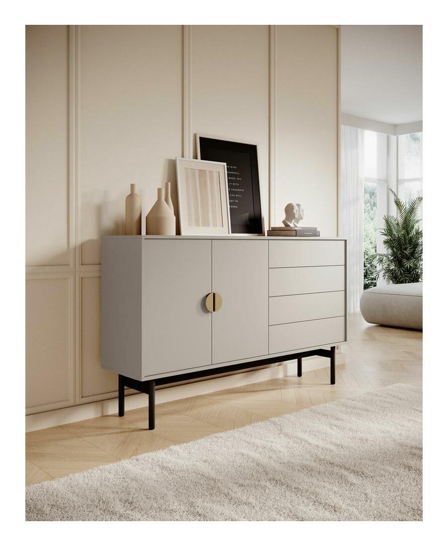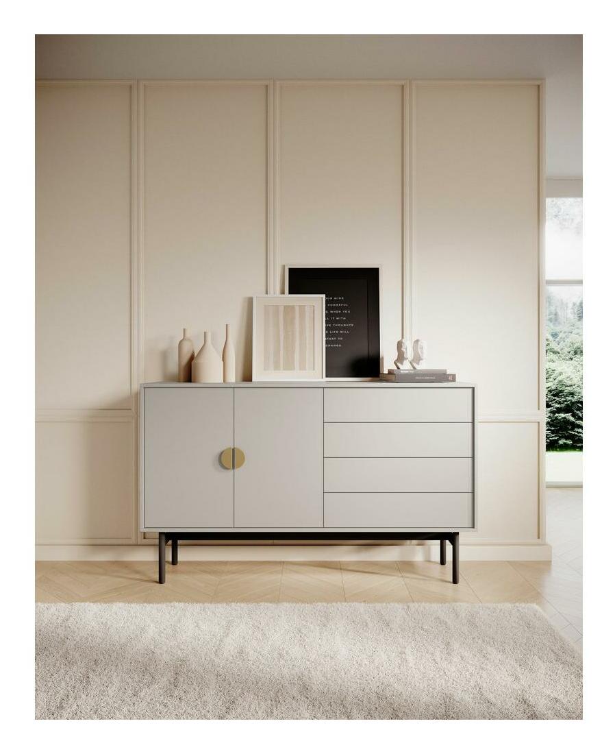 MutasdVáltozást szeretne végrehajtani a belső térben? Szereti az eredeti megoldásokat és az egyszerű bútorformákat? Kollekciónkat választva harmóniát és eleganciát visz a belső térbe, és megörvendezteti vendégeit Az egyedi kialakítású, elegáns bézs-szürke színű komód tökéletesen illeszkedik a modern enteriőrbe. Kiváló minőségű laminált forgácslapból készült, amely biztosítja a hosszú távú és problémamentes használatot. Karakterét masszív acélból készült váz teszi gazdagabbá, amely nemcsak tartóssá teszi a bútort, hanem ipari bájt is kölcsönöz neki. A kört formáló arany fogantyúk nemcsak praktikus elem, amely megkönnyíti a nyitást, hanem eleganciát és lágy fényt ad az egész szekrénynek. Ez az apró, de kifinomult részlet kiemeli a bútort, és enyhén fényűző akcentust kölcsönöz neki. A komód a funkcionalitást szem előtt tartva készült, így négy fiókkal rendelkezik a nélkülözhetetlen cikkek, az elektronikai cikkek és a ruhatári cikkek számára. A szokatlan szín kombinációja a fekete kerettel és az arany fogantyúkkal harmonikus és modern egészet hoz létre, amely tökéletesen illeszkedik a különféle belső elrendezésekhez, és egyedi karaktert ad nekik. Ez a komód nem csak praktikus tárolási megoldás, hanem dizájnelem is, amely minden helyiség egyedi stílusát díszíti és kiemeli. Termék részletek: Szürke Taupe U750 ST9 laminált lapból készült, nedvességnek, magas hőmérsékletnek ellenálló korpus és előlapok. Fekete porszórt acél keret, ami megkönnyíti a rendet a bútorok alatt, 'push to open' módszerrel nyitható fiókok, szálcsiszolt acélból készült arany színű fogantyúk.