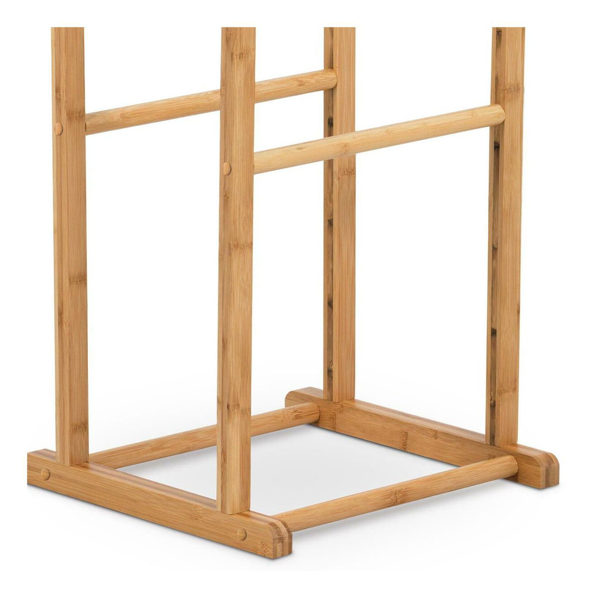 Praktikus, szobainas retró és természetes hangulattal. A szerkezet tömör bambuszból készült, natúr felülettel és átlátszó lakkal bevonva. A 103 cm-es magasság és a dupla keret lehetővé teszi, hogy számos ruhadarabot és kiegészítőt egy helyen, teljesen gyűrődésmentesen akassz fel. Ezt biztosan értékelni fogod a reggeli stressz idején, ahelyett, hogy az egész lakásban keresgélnél. Az állvány teherbírása egyenletesen elosztott terhelés esetén akár 5 kg, a súlya kevesebb, mint 3 kg. Ezért könnyen hordozható, és az aktuális igényeknek és hangulatnak megfelelően elhelyezhető. Stílusának és egyszerűségének köszönhetően bármilyen enteriőrbe illik. A felhasználási lehetőségek végtelenek, csak rajtad múlik.