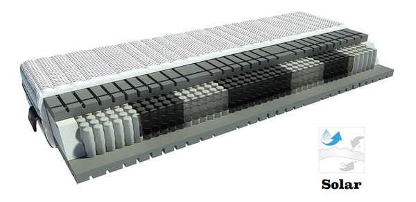 Pocket matrac az ideális alvásért, Multipocket rugókkal, hét keménység zónával, pontos rugalmassággal és nagyon rugalmas habszivacs betéttel. A matrac kétoldalú. Solar membránon készült szövet, Öko-Tex Standard 100 bizonyítvánnyal, csúszásgátlóval az egyik és Anti allergén réteggel a másik oldalán. Hála a nagymennyiségű viszkóz szálak tartalmának magas minőségű. Nagyon puha és biztosija a kellő rugalmasságot. A huzatját négy oldalról szét lehet nyitni és egyszerűen kimosható.