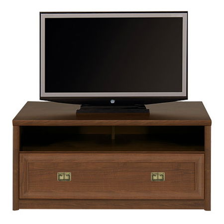 TV asztal szép dizájnban a televízió alá. A szabadon elosztott polcra elhelyezheti az AV berendezéseit. Praktikus fiók is van rajta, fém fogantyúkkal.