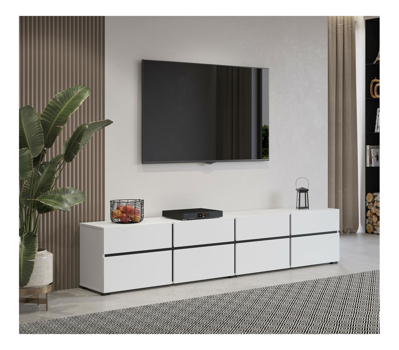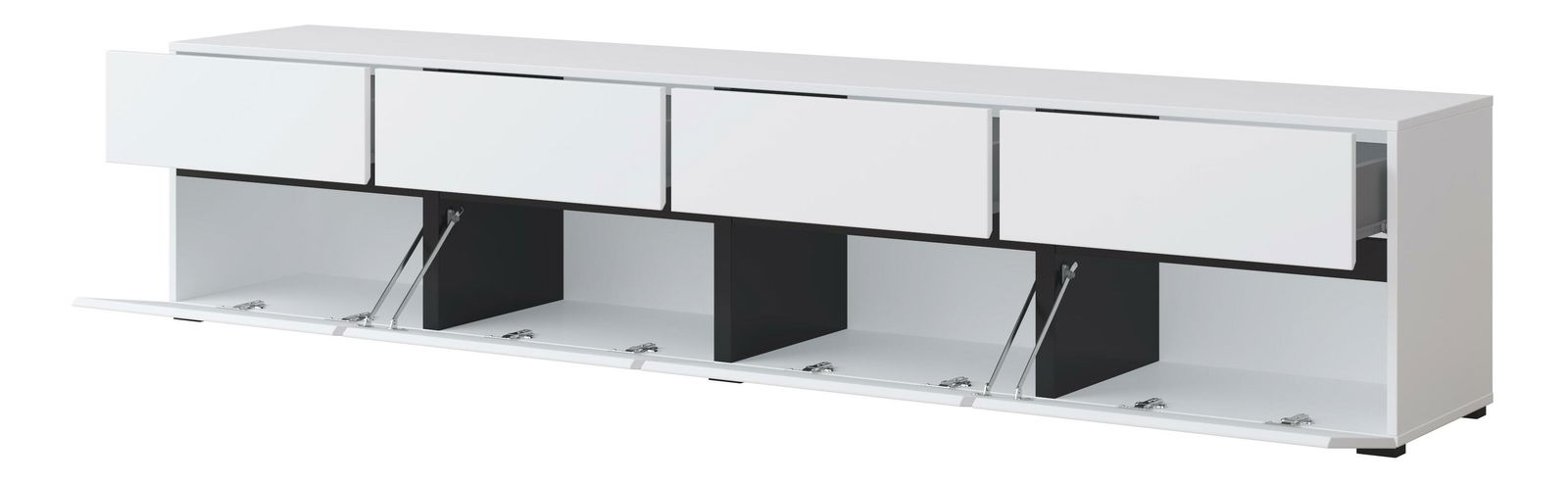MutasdEz a TV-szekrény modern és praktikus megoldás minden lakótérhez. Kiváló minőségű laminált forgácslapból készült, ABS élekkel, tartósságot és hosszú élettartamot biztosít. A szekrény elegáns, alacsony fekete lábai stabilitást és stílusos megjelenést biztosítanak. A fogantyú nélküli rendszer megkönnyíti a nyitást és megőrzi a dizájn tiszta vonalait. A szekrény négy fiókkal és három ajtóval rendelkezik, amelyek csuklósan nyílnak lefelé, így könnyen hozzáférhetnek a tárolt tárgyakhoz. A fehér és fekete kombinációjú belső részek elegáns kontrasztot teremtenek, amely élénkíti a belső teret, és elegendő helyet biztosít a multimédiás eszközök és tartozékok tárolására.