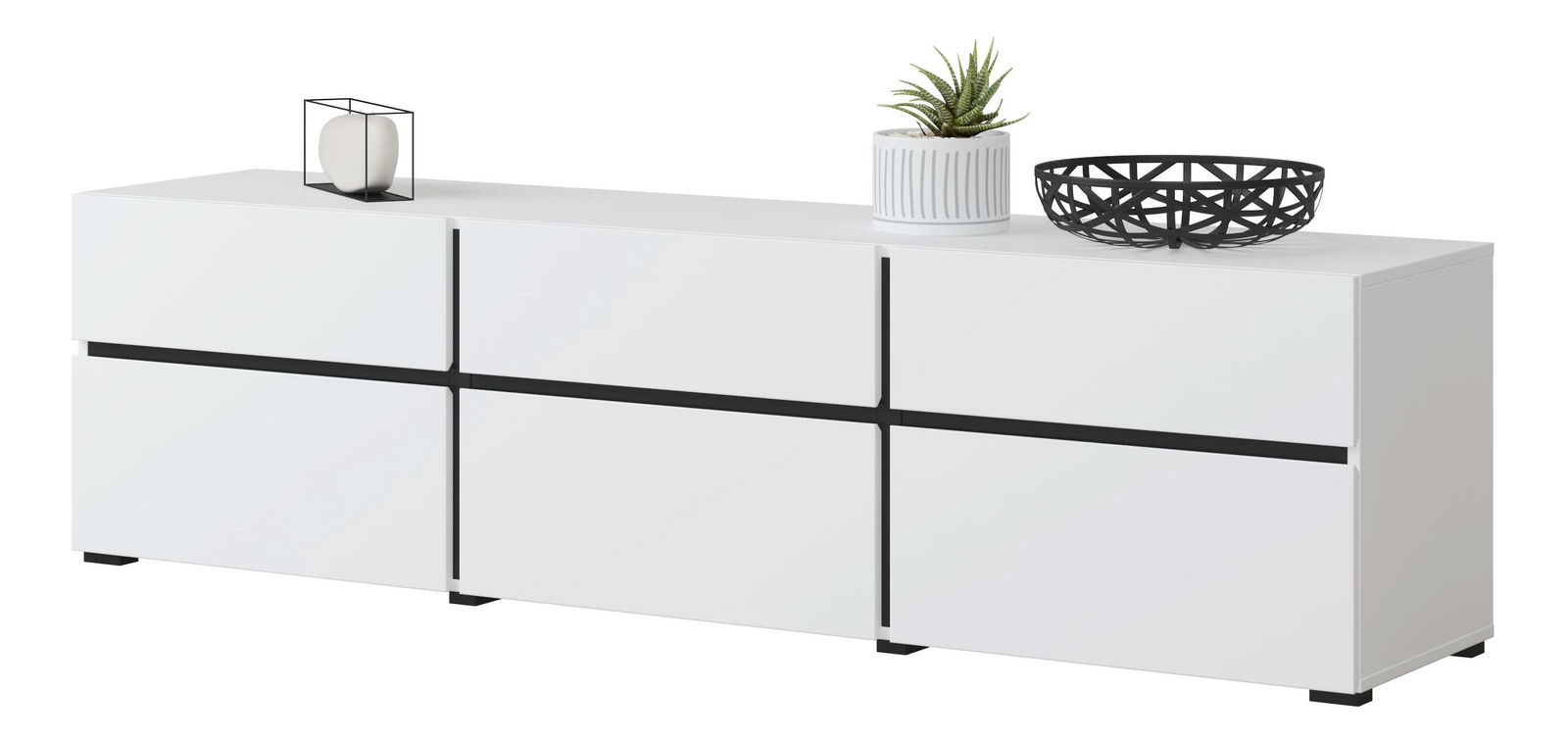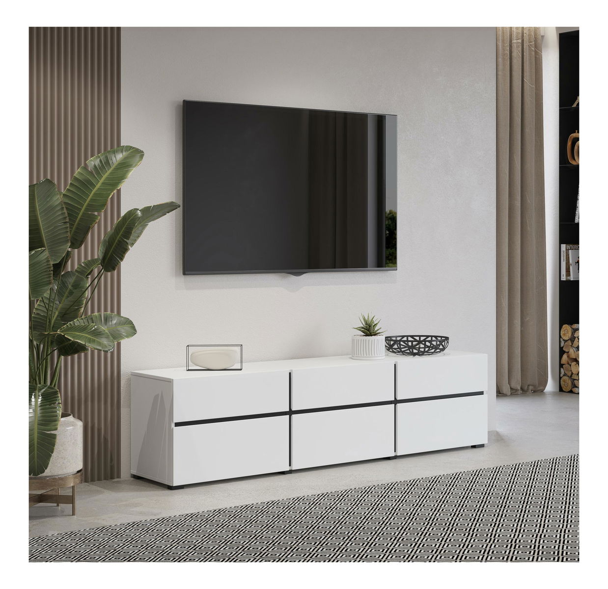 MutasdEz a modern TV-szekrény ideális azok számára, akik funkcionális és elegáns kiegészítőt keresnek a lakótérben. Minőségi laminált forgácslapból készült, ABS élekkel, tartós és könnyen karbantartható. Alacsony fekete lábai stabilitást és kifinomult megjelenést biztosítanak. A szekrény fogantyú nélküli rendszerrel van felszerelve, amely zavaró elemek nélkül biztosítja a sima és könnyű nyitást. Három fiókkal és három lefelé nyíló, csuklós ajtóval rendelkezik, amelyek praktikus hozzáférést tesznek lehetővé a tárolóhelyekhez. A fehér és fekete belső tetszetős kontrasztot biztosít, de a szekrény nem tartalmaz külön helyet az audio- vagy videoberendezések számára, így kompakt és minimalista berendezésekhez vagy dekorációkhoz alkalmas.