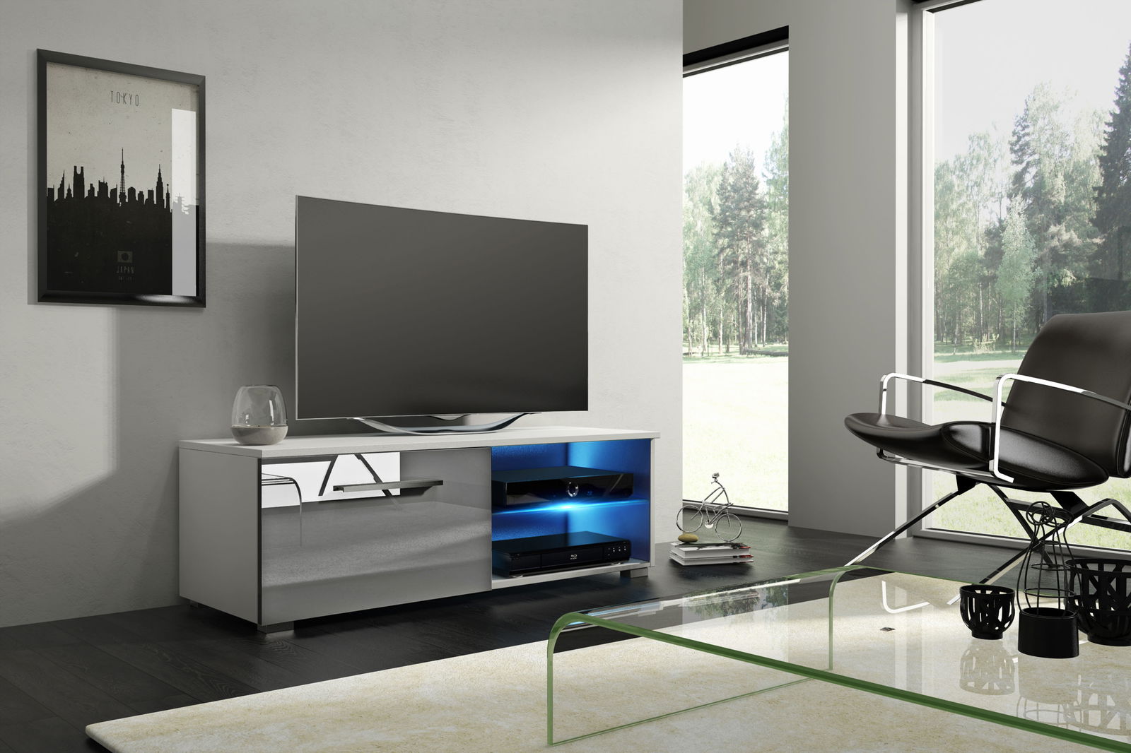 A kék LED világítás hozzávásárolható a tv szekrényhez.