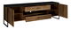 TV asztal Taren. Az asztal két kimeneti lyukkal, két fiókkal, polcokkal és egy nyitott fióknyílással van ellátva.