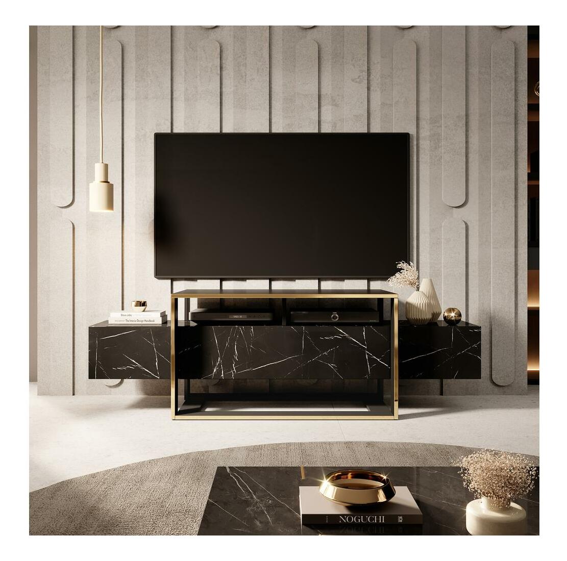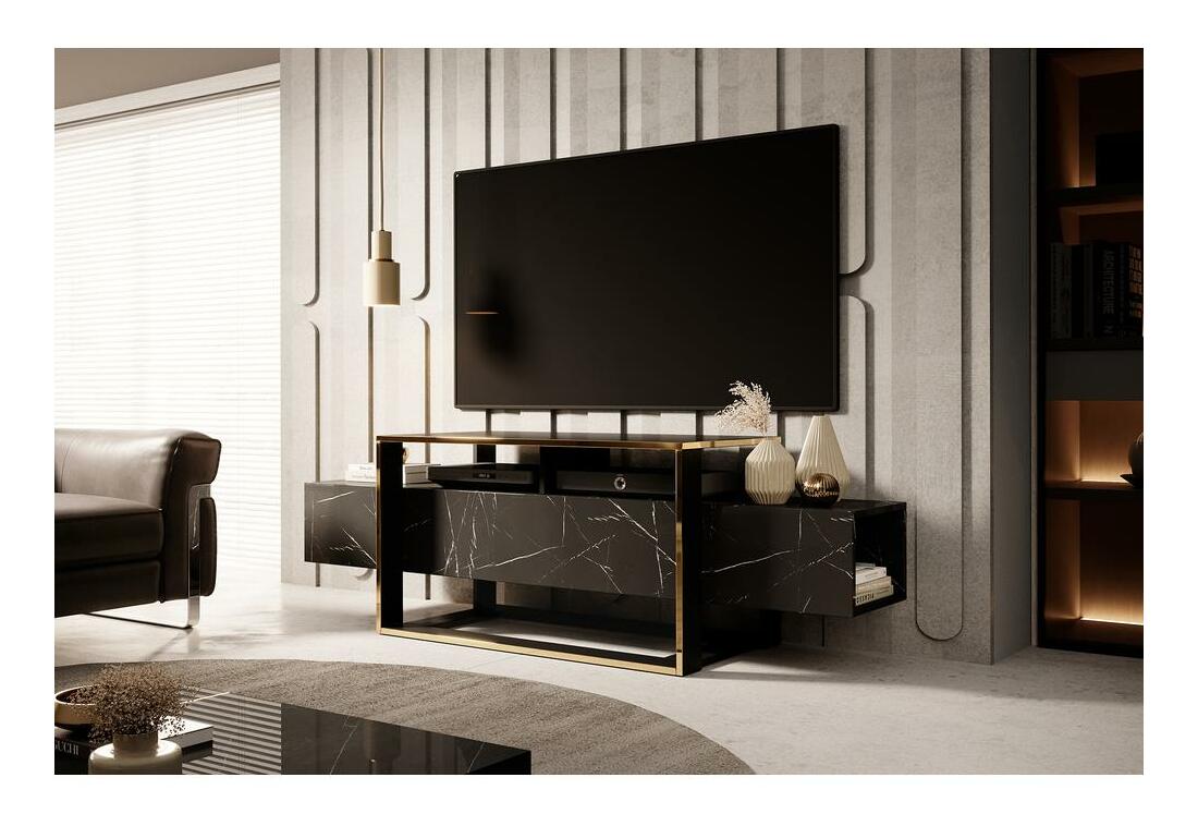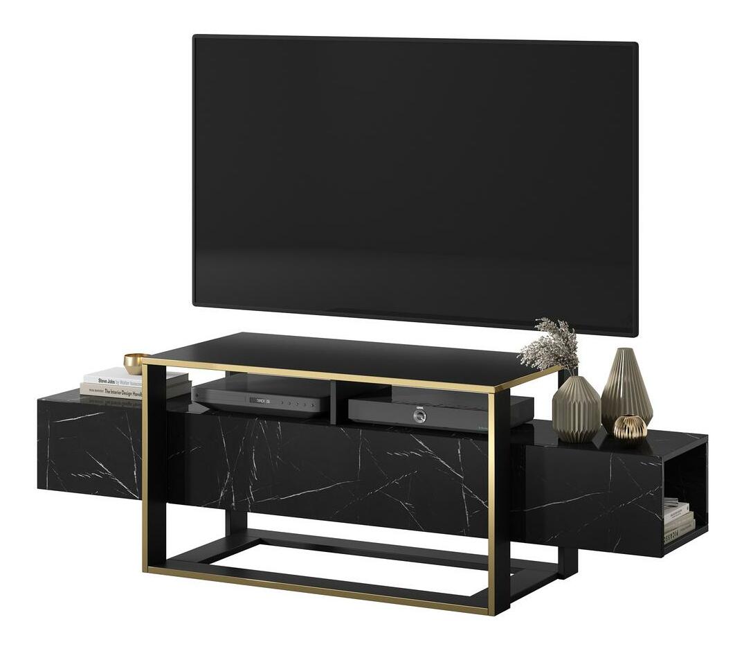 Nagyra értékeli a modern és egyedi belső tereket? Akkor a TV-szekrény legyen az elrendezésed alapja! A bútorokat a szokatlan forma jellemzi, emellett fekete márványt és aranybetéteket imitáló dekorációval gazdagítva, amelyek tökéletesen kiegészítik az egészet. A szekrény öt polcos - sikeresen használható elektronikai cikkek, könyvek vagy dekorációs dekorációk tárolására. A hiányzó oldalfalak a megfelelő légáramlásnak köszönhetően megakadályozzák a készülék túlmelegedését. További előnye a zárható szekrény, amelybe minden olyan tartozék elfér, aminek általában nincs helye a szobában – a töltőtől a fontos dokumentumokig. Termékleírás: anyaga: fekete gyöngy forgácslap 16mm + arany díszítés, a zárt szekrény eleje lefelé nyílik, oldalán nyitott polc is található, színe: fekete márvány.