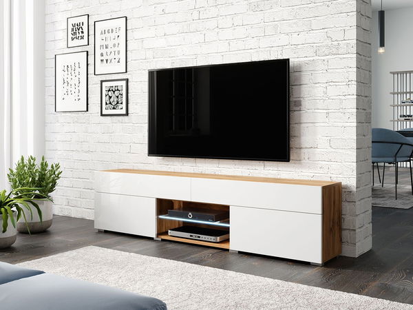 - TV szekrény Primrose (wotan tölgy + fényes fehér) (fehér LED világítás)